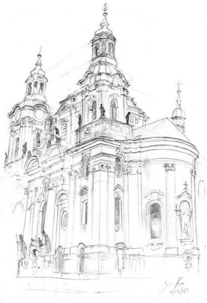 A three-hour on-site sketch of one of Praha's many beautiful Baroque buildings.