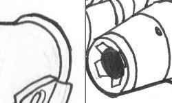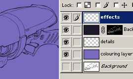 So you've just finished a sketch and it's in Photoshop ready to colour. Now it's time to ask how you're going to turn that opaque black and white sketch into an transparent overlay to use either as a guide for your painting or as the linework for your cell-shading. This tutorial will show you what I do to prepare linework for painting. I'm using this sketch of a high-tech Halo-style plasma gun as an example. |