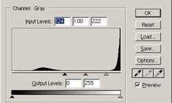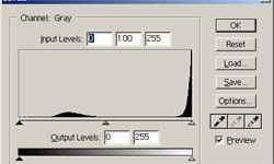 3. The Levels adjustment tool is very useful for adjusting the balance of values in your image. Have a go at sliding the three triangles to different positions and watching the result. In the end, I prefer having the values set as shown on the left. | |