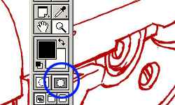 8. Hit "Q" to turn Quick Mask on or click on the button itself, shown circled. This overlays all UNSELECTED areas on your image with red. Don't panic, the red hasn't be painted onto your work, it's just an indication of what area's have been "masked out". | |