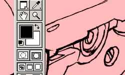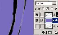12. Now you're ready to colour, either on the "colouring layer" or on layers added above or below the masked layer. You can also paint colours into the linework while the layer mask is still active. | |