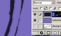 10. Fill your "colouring layer" with any colour at all, like you're starting to paint. See the grey areas around your lines? These can be fixed by clicking on the left thumbnail of your background duplicate layer, choosing a dark colour from the colour-picker like a dark grey-blue, selecting the entire layer with "Select" -> "All" from the top menu and then filling the layer with "Edit" -> "Fill..." | |